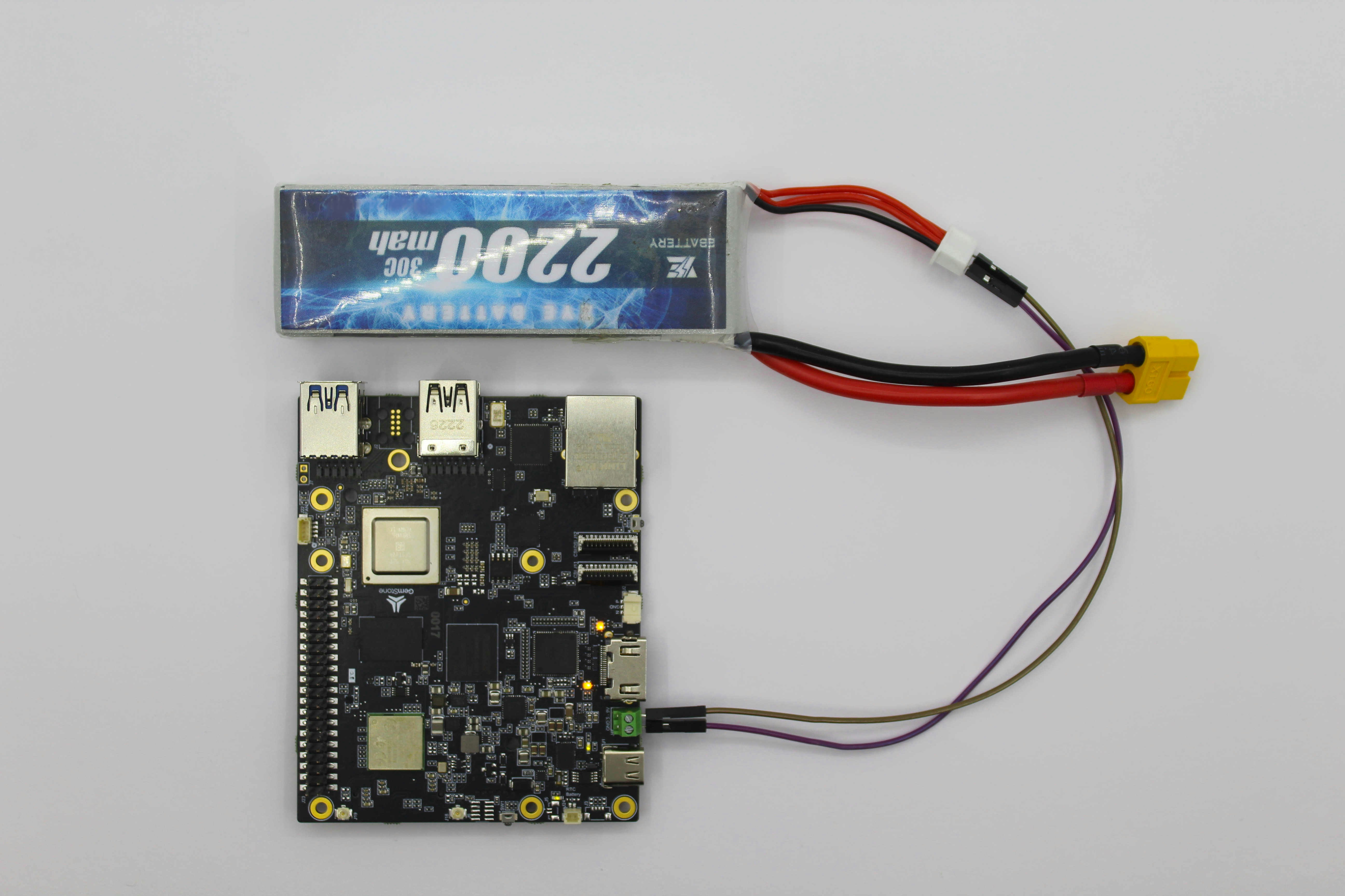 If the 12V battery is connected backwards while the USB is plugged in, the development board may be seriously damaged and there may even be a risk of fire. Therefore, the polarity must be checked before connecting the battery while the power connection is via USB.