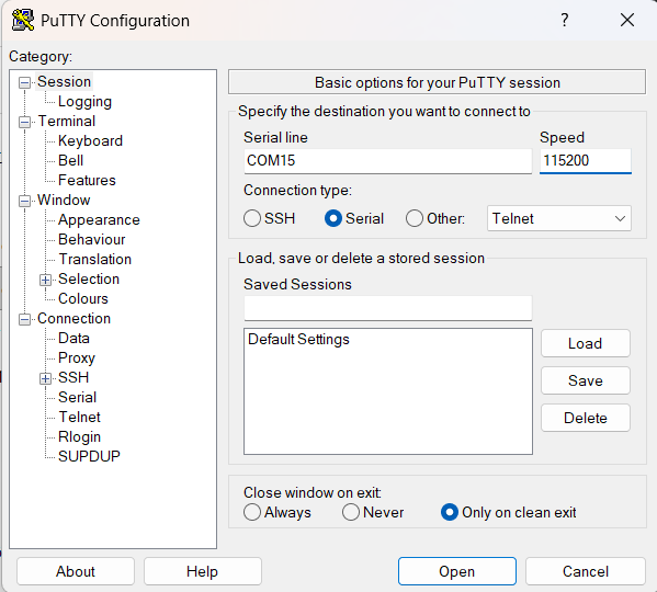 Putty İndirme sayfasına giderek kullandığınız işletim sistemine uygun putty kurulum dosyasını indiriniz. Kurulumu tamamladıktan sonra çalıştırınız ve aşağıdaki ekran görüntüsünde yer alan bağlantı türünü seçerek kartınıza bağlantı yapabilirsiniz.