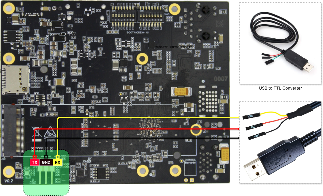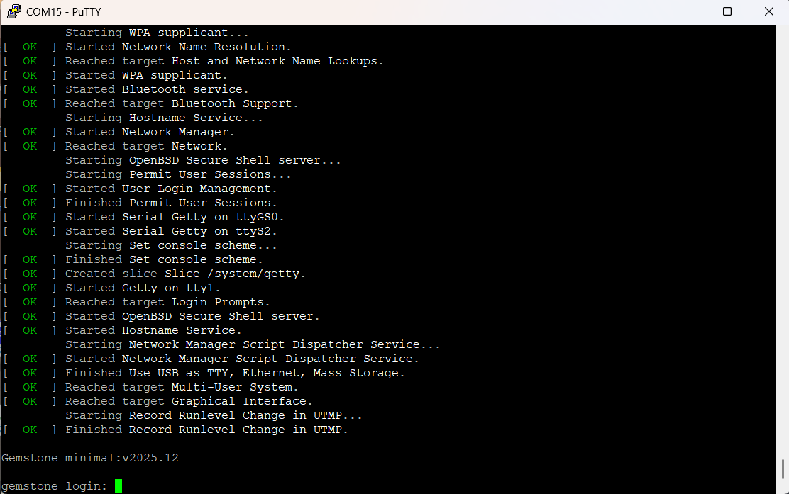 USB TTL dönüştürücü kablosu çoğu zaman ethernet bağlantısının olmadığı durumlarda seri port aracılığıyla karta bağlanmak içindir. Normal şartlarda Gemstone kartınızı Usb Type-C kablosu ile bilgisayarınıza bağladığınızda Sistem Özelleştir bölümünde bulunan Servisler alanındaki “Gadget”lar işaretlenmiş ise TTL kablosuna gerek kalmadan seri port bağlantı imkanı olmaktadır. Fakat geliştirme sırasında beklenmedik bir durum söz konusu olduğunda bu özellikler çalışmazsa USB TTL kablosu ile de karta bağlanmak mümkündür. Bu yöntem ile bağlantı sağlamanın bir avantajı Gemstone kartlarında bulunan U-Boot ismi verilen ön yükleyicinin (Bootloader), konsol çıktılarını da görüntülemenizin mümkün olmasıdır. Ethernet üzerinden bağlantı sağladığınızda Ağ ilklendirme yapılana kadar konsolda çıktılar gözükmezken, TTL ile başlangıç aşamasından itibaren gözükür.2.1.1. Terminal/Konsol Uygulaması